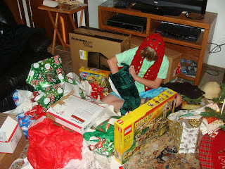 Today, we woke Raine up at the crack of 10:30 to open presents. She enjoyed herself, building a fortress of wrapping paper and surrounding herself with gifts.